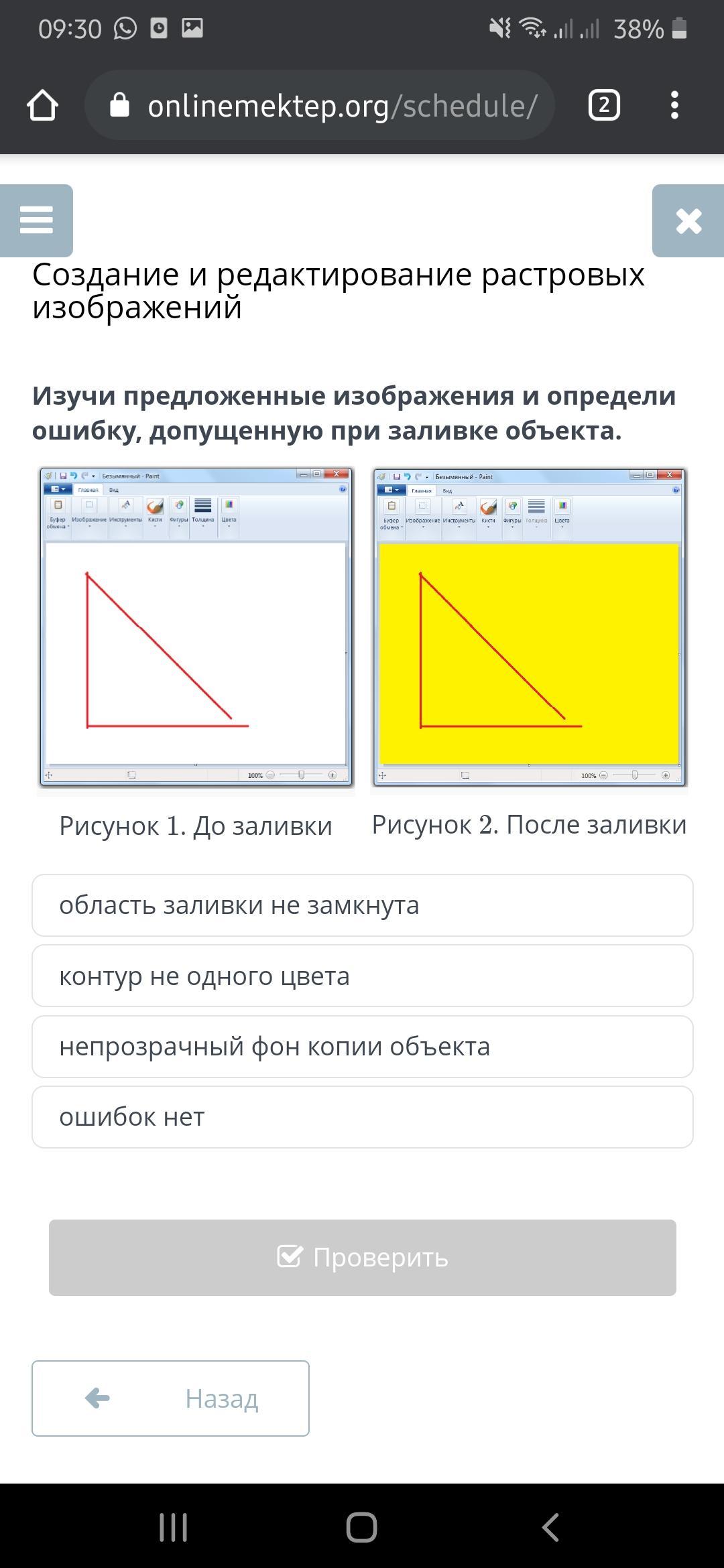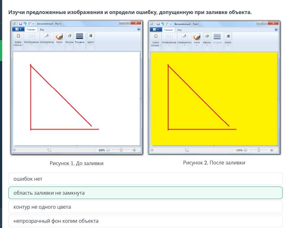 Изучи предложенные изображения и определи ошибку, допущенную при заливке объекта.