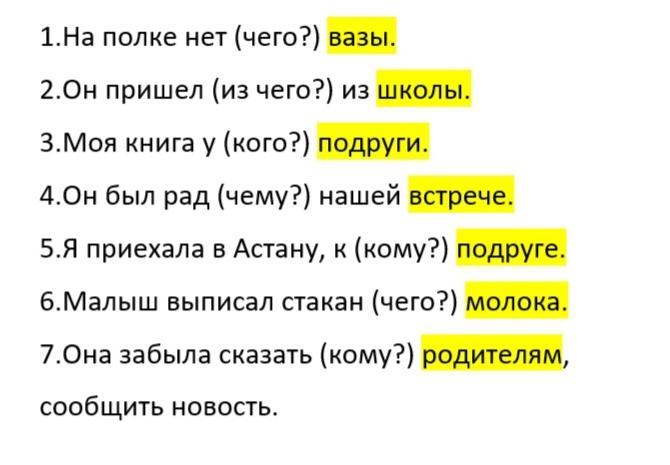 Имена существительные в родительном и дательном падеже выделены желтом цветом.