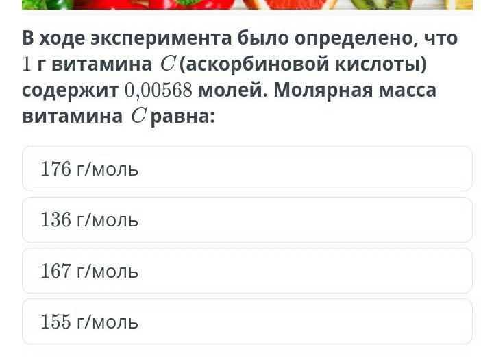 в ходе эксперимента было определено, что 1 г витамина C (аскорбиновой кислоты) содержит 0,00568 молей. Молярная масса витамина C равна:
