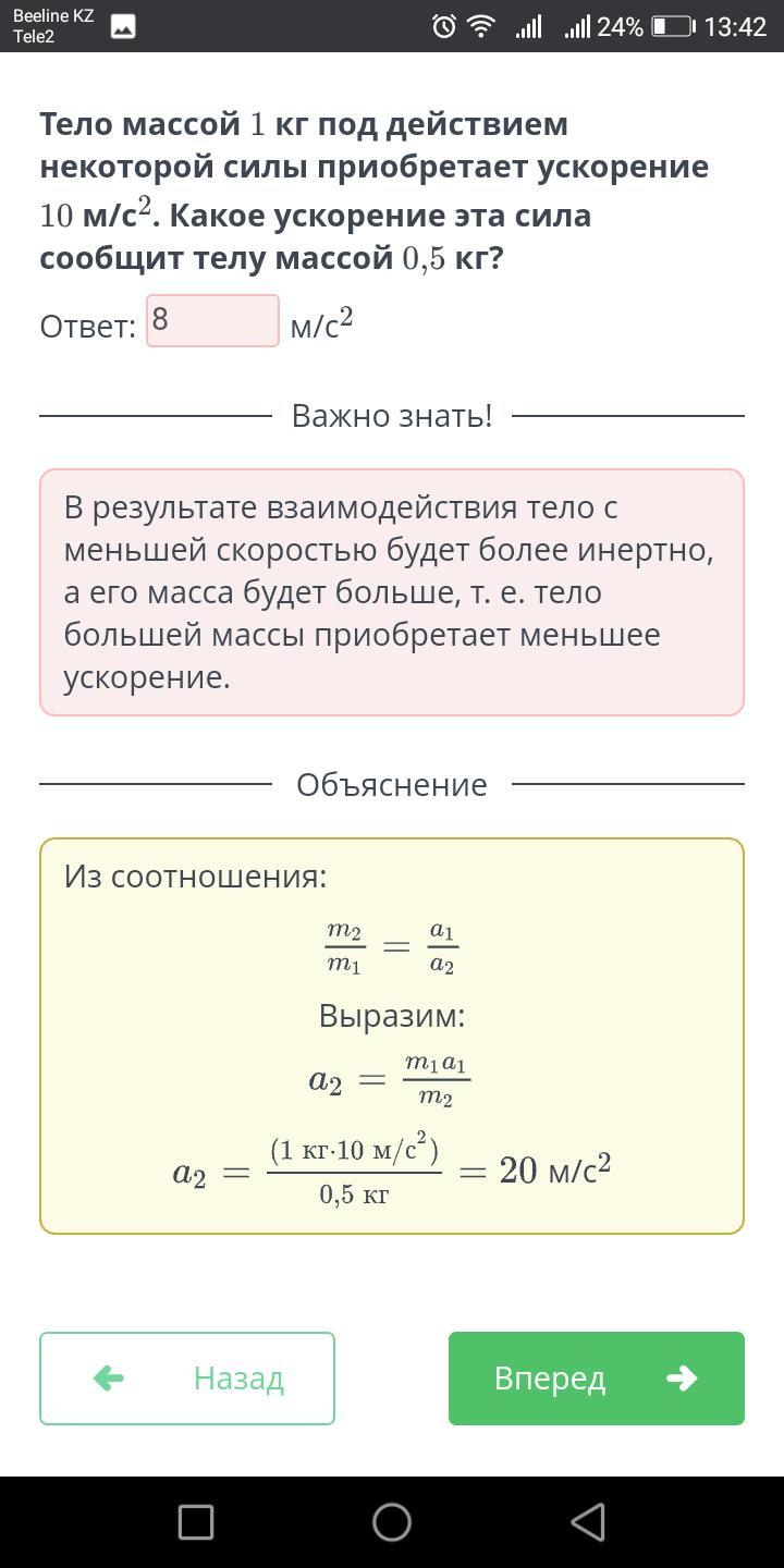Тело массой 1 кг под действием некоторой силы приобретает ускорение 10 м/с2. Какое ускорение эта сила сообщит телу массой 0,5 кг?
