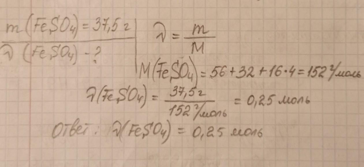 Рассчитайте количества вещества соответствующего сульфата железа (II) FeSO4 массой 37,5 грамм. (Ответ до сотых)