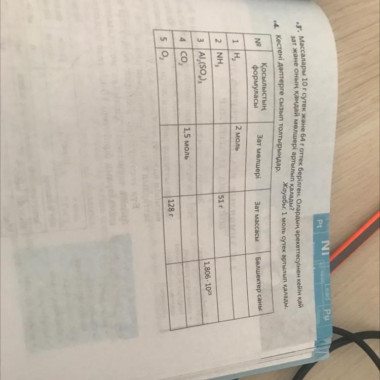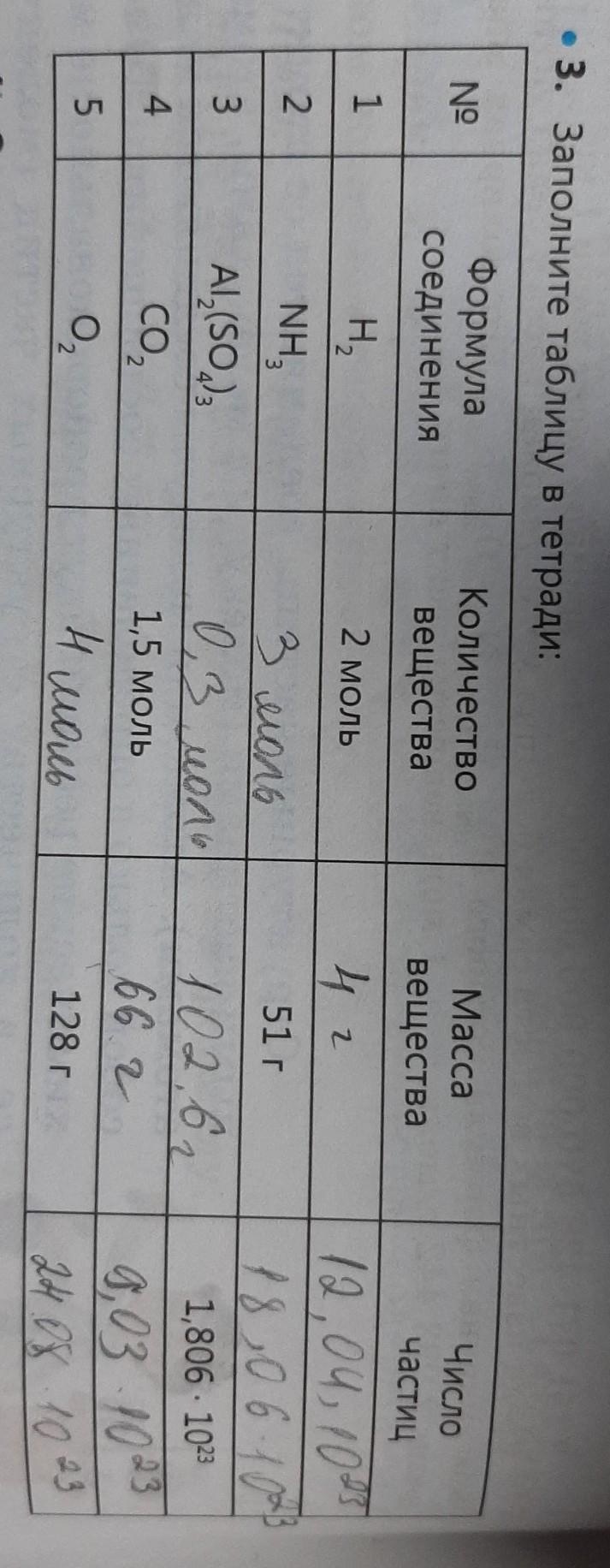 4. Заполните таблицу в тетрадях. Формула соединения NO Количество вещества Масса вещества Количество частиц 1 IN, 2 моль 2 (NH, 51 г 3 Al (SO2) 4 CO₂ 1,806-1023 1,5 моль 5 0, 128 г