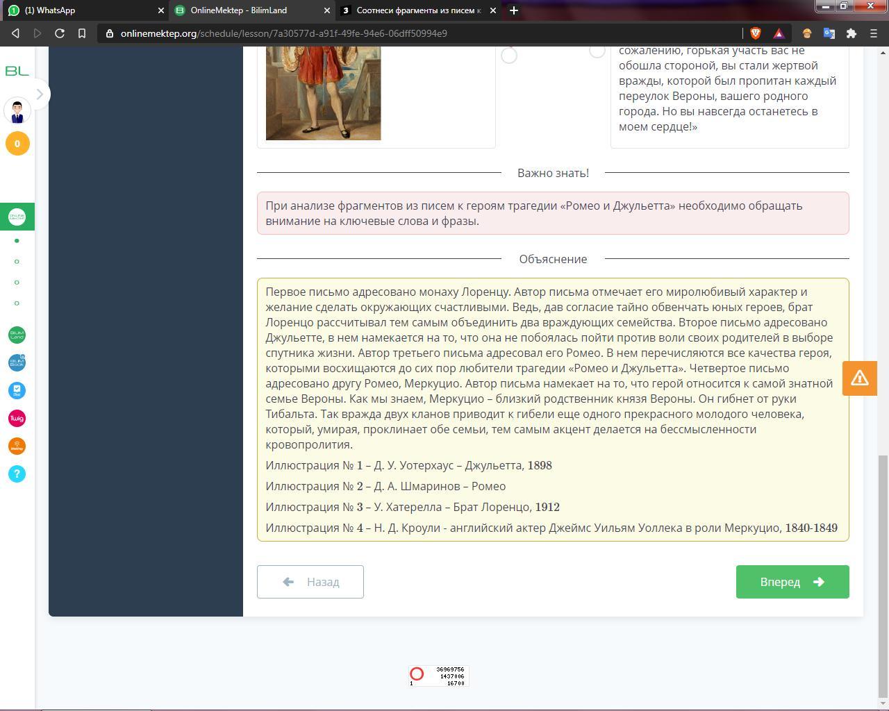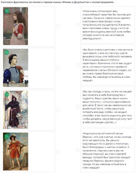 Соотнеси фрагменты из писем к героям пьесы «Ромео и Джульетта» с иллюстрациями.