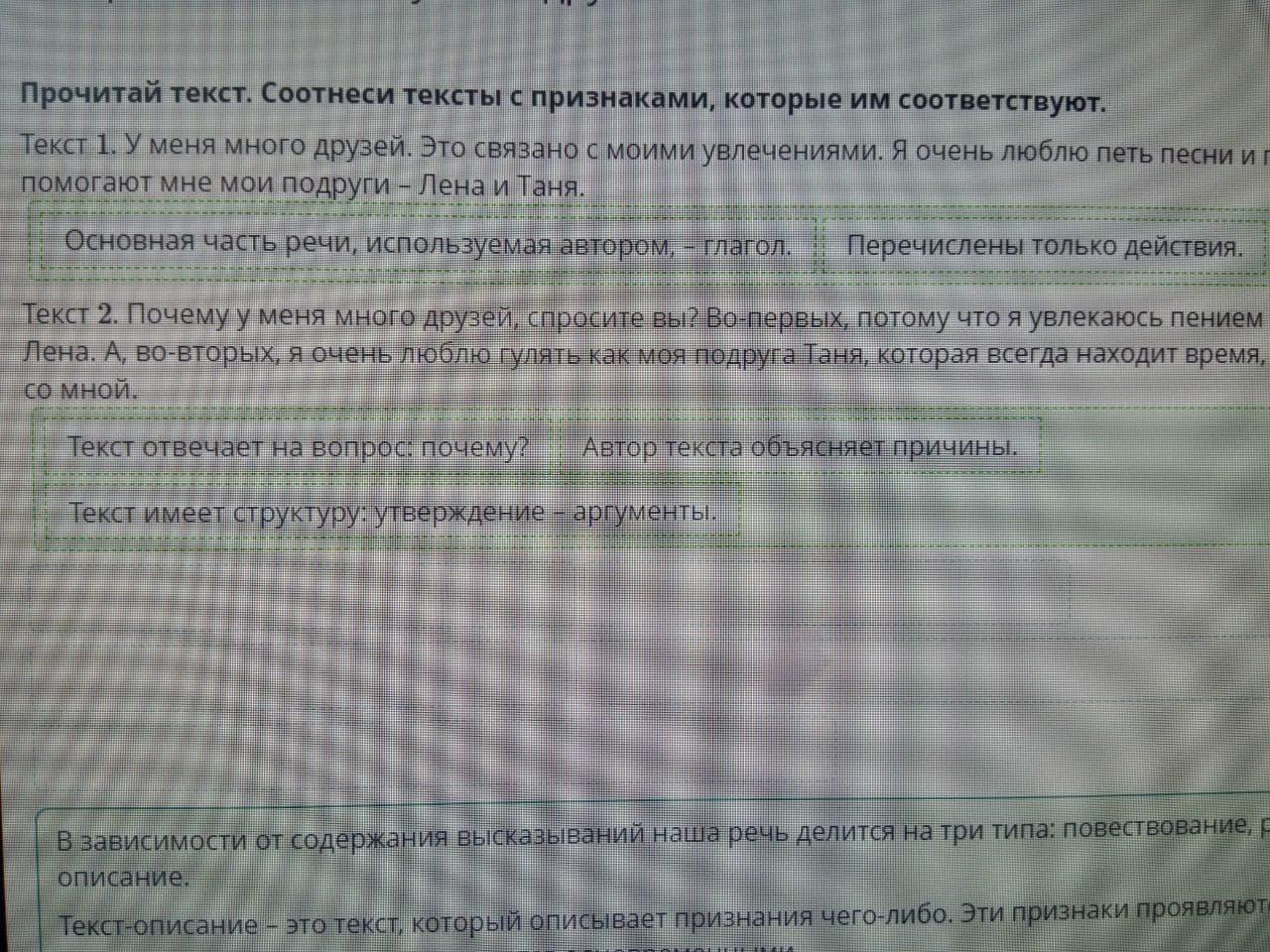 Прочитай текст. Соотнеси тексты с признаками, которые им соответствуют.