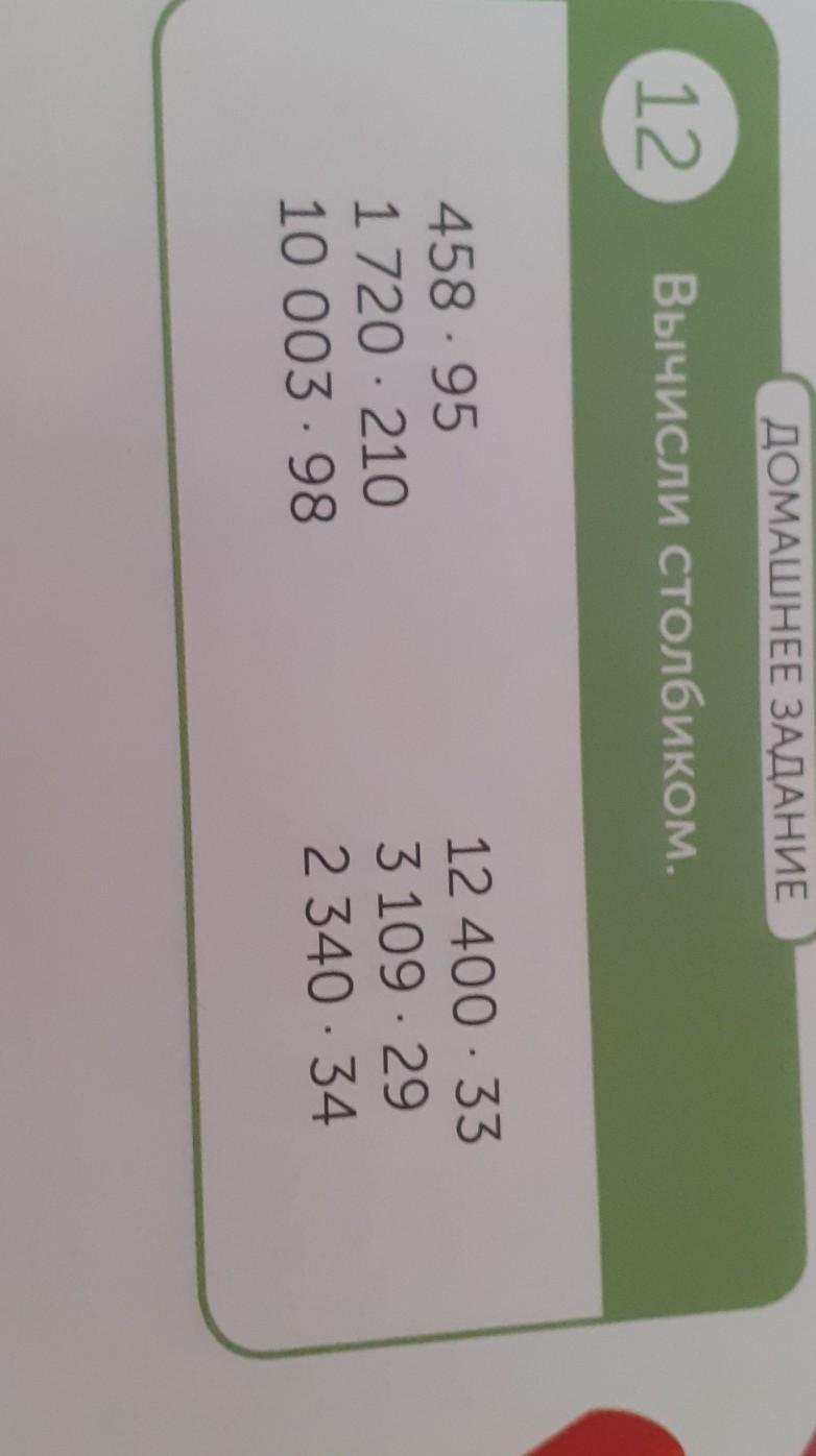 Ответ:1) 458*95=43510 2) 1720*210=361200 3) 10003*98=980294 4) 12400*33=409200 5) 3109*29=90161 6) 2340*34=79560