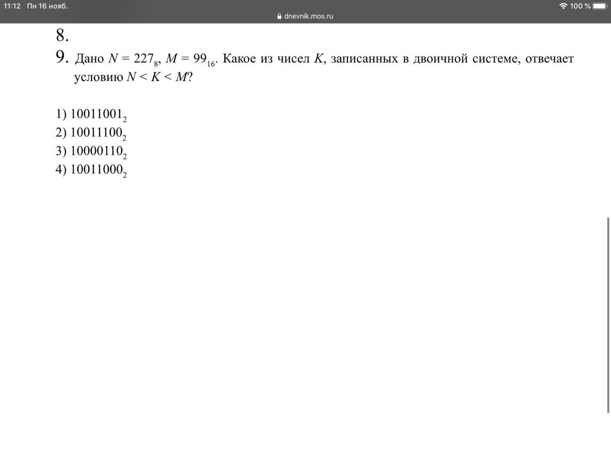 10011000 в 2 СС = 1 * 2^7 + 0 * 2^6 + 0 * 2^5 + 1 * 2^4 + 1 * 2^3 + 0 * 2^2 + 0 * 2^1 + 0 * 2^0 = 1 * 128 + 0 * 64 + 0 * 32 + 1 * 16 + 1 * 8 + 0 * 4 + 0 * 2 + 0 * 1 = 128 + 16 + 8 = 152 в 10 СС