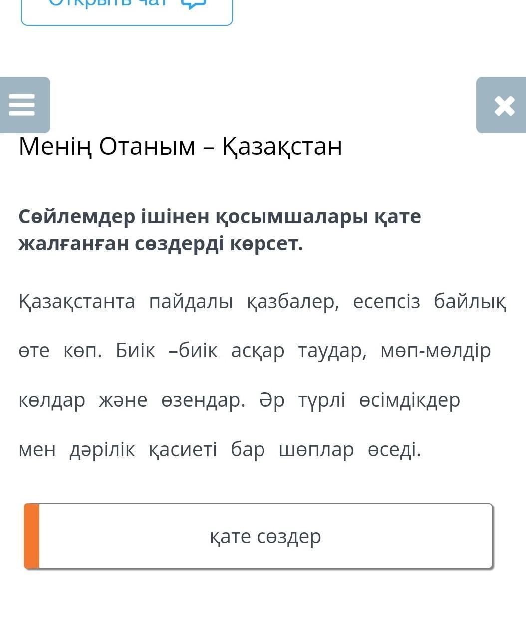Ребята. То что вы писали ЯНЕ ПРАВИЛЬНО. правильно вот. Қазақстанта қазбалар таулар қолдар озендар өсімдіктер шоплар