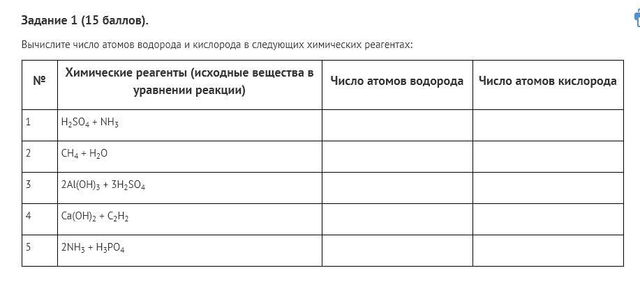 Вычислите число атомов водорода и кислорода в следующих химических реагентах: