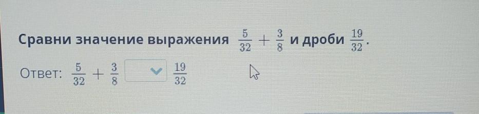 Сравни значение выражения 5/32 + 3/8 и дроби 19/32.