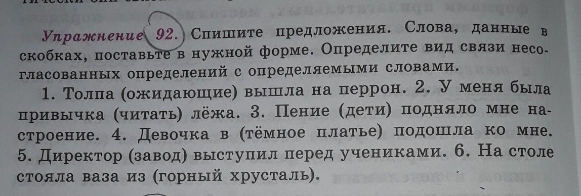 1.Толпа ожидающих вышла на перрон2..У меня была привычка читать лёжа.3.Пение детей подняло мне настроение.4.Девочка в тёмном платье подошла ко мне.5.Директор завода выступил перед учениками.6.На столе стояла ваза из горных хрусталика.