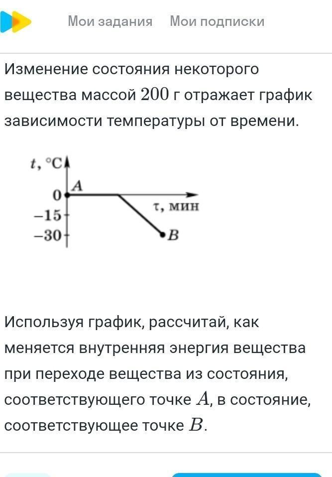Изменение состояния некоторого вещества массой 200г отражает график зависимости температуры от времени. Используя график, рассчитай, как меняется внутренняя энергию вещества при переходе вещества из состояния, соответствующего точке А, в состояние, соответствующее точку B.