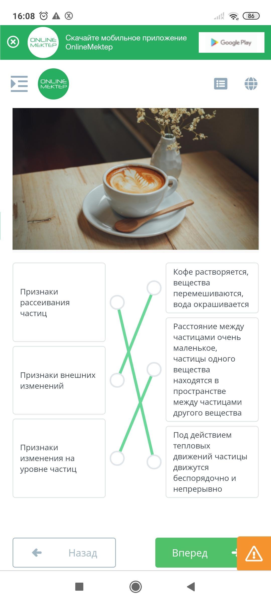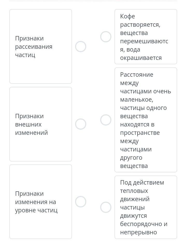 Когда гранулы кофе заливают горячей водой, происходит диффузия. Сопоставь признаки с их описанием.