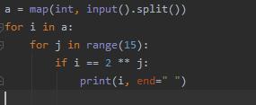 1. Напишите код программы, которая при вводе списка чисел определяет, какие из введенных чисел являются степенями числа 2, и выводит их на экран через пробел в одну строку.