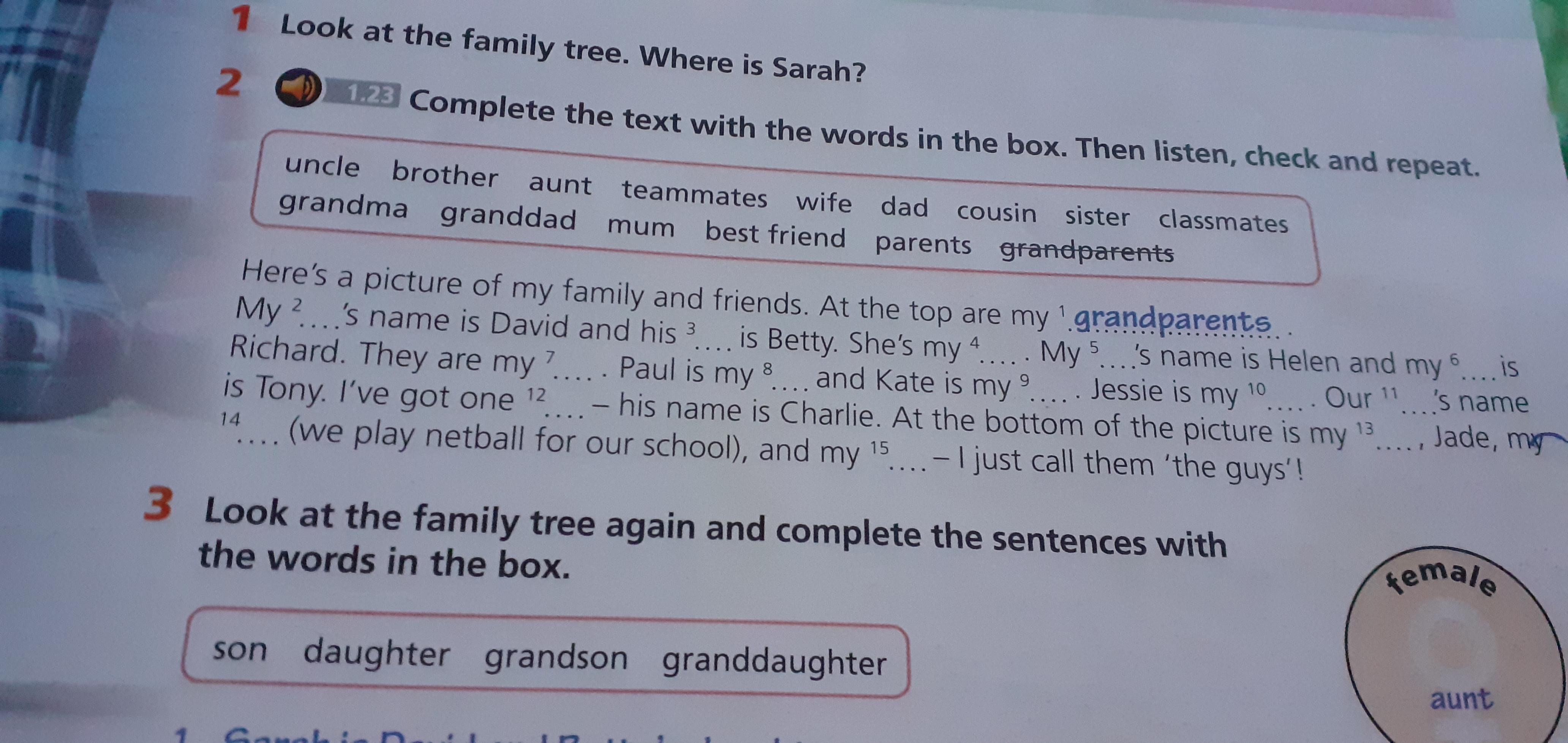Ответ:granddad's, whife, grandma, mum's, dad's, parents, brother, sister, aunt's, uncle, cousin, best friend, classmates.