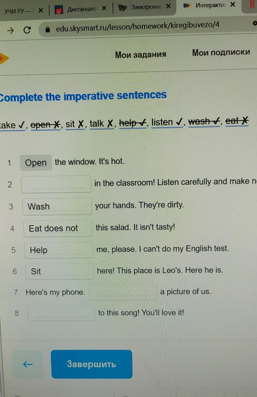1 open 2 Don’t talk 3 Wash 4 Don’t eat 5 Help 6 Don’t sit 7 Take 8 Listen
