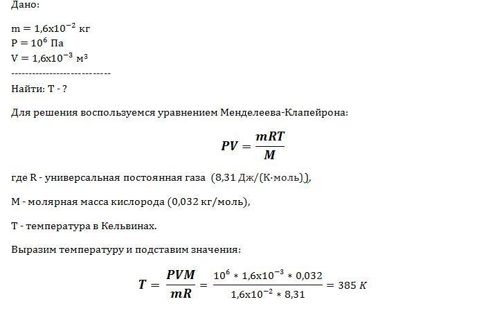 какова температура 1,6*10^-2 кг кислорода , находящегося под давлением 10^6 Па и занимающегося объем 1,6*10^-3м?молярная масса кислорода 0,032 кг/моль