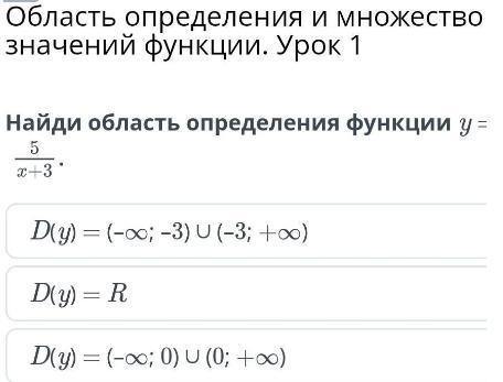 Найди область определения функции y = D(y) = R D(y) = (–∞; –3) ∪ (–3; +∞) D(y) = (–∞; 0) ∪ (0; +∞)