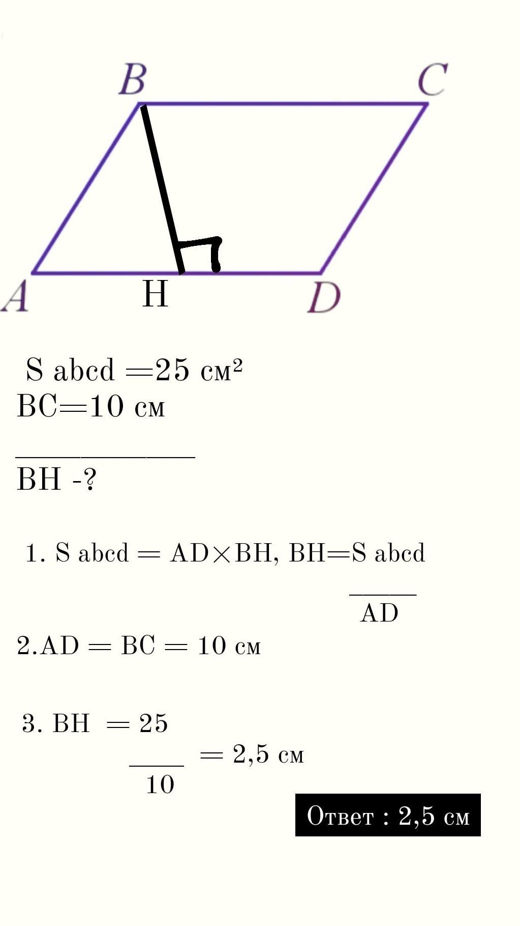 Площадь параллелограмма ABCD равна 25 см2. Чему равно расстояние от вершины B до прямой AD, если BC = 10 см? с решением пожалуста