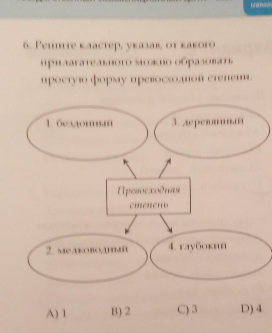 Объяснение: бездонный, деревянный и мелководный - относительные прилагательные, они выражают признак предмета по отношению, так что мы не можем выразить их степень. Правильный ответ «глубокий», так как можно сказать «глубочайший» и «самый глубокий» - это превосходная степень (выражается в суффиксах -айш- и -ейш-, а также в слове «самый»