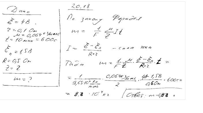 Определить внутреннее сопротивление батареи аккумуляторов с ЭДС = 4В, которая присоединена к электролитической ванны с раствором медного купороса. Масса меди которая выделилась за 10 минут, равна 0,83 г, сопротивление раствора 0,5Ом. Медь двухвалентна.