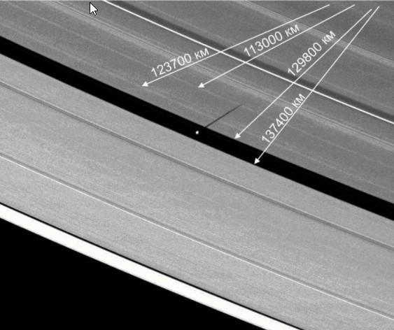 На фотографии колец Сатурна запечатлена тень, отбрасываемая на кольца одним из спутников планеты. Стрелками на рисунке показаны радиусы соответствующих колец Сатурна. В таблице приведены некоторые параметры тел Солнечной системы.