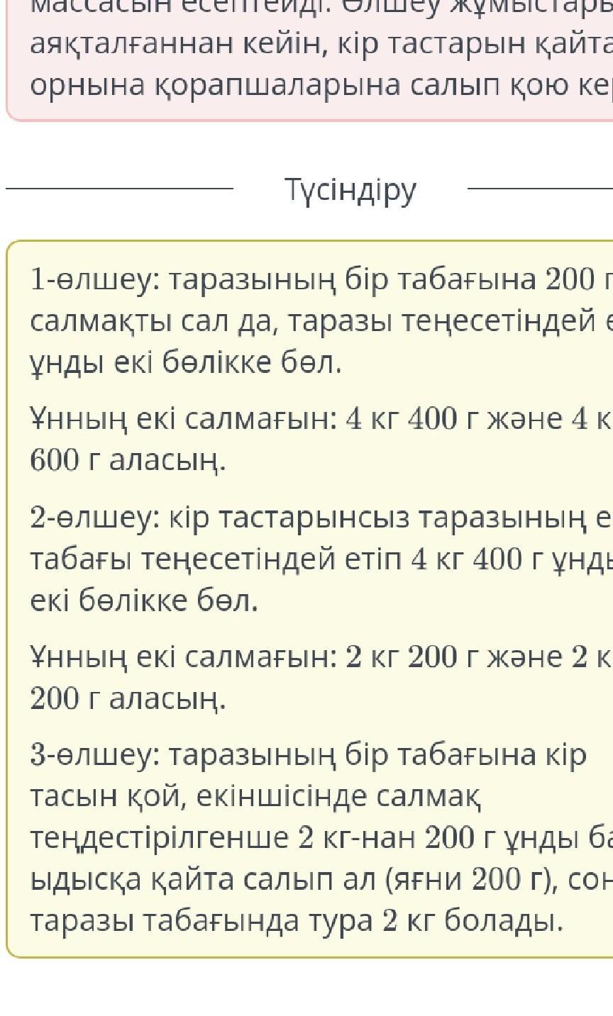 Қапта 9 кг ұн бар. 2 кг ұн тарту үшін шағын таразы мен 200 грамдық кір тастарының көмегімен неше рет өлшеу керек?