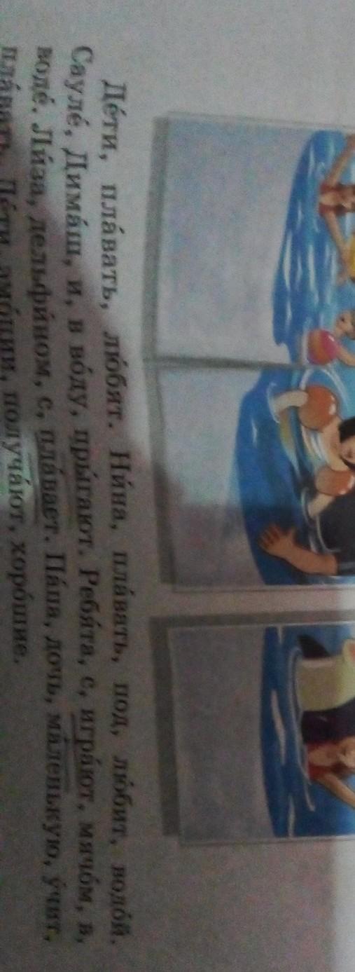 1- дети любят плавать. 2-Нина любит плавать под водой. 3-Сауле и Димаш прыгают в воду. 3-Ребята играют с мячом в воде 4-Лиза плавает с дельфином. 5-Папа учит маленькую дочь плавать.6- Дети получают хорошие эмоции