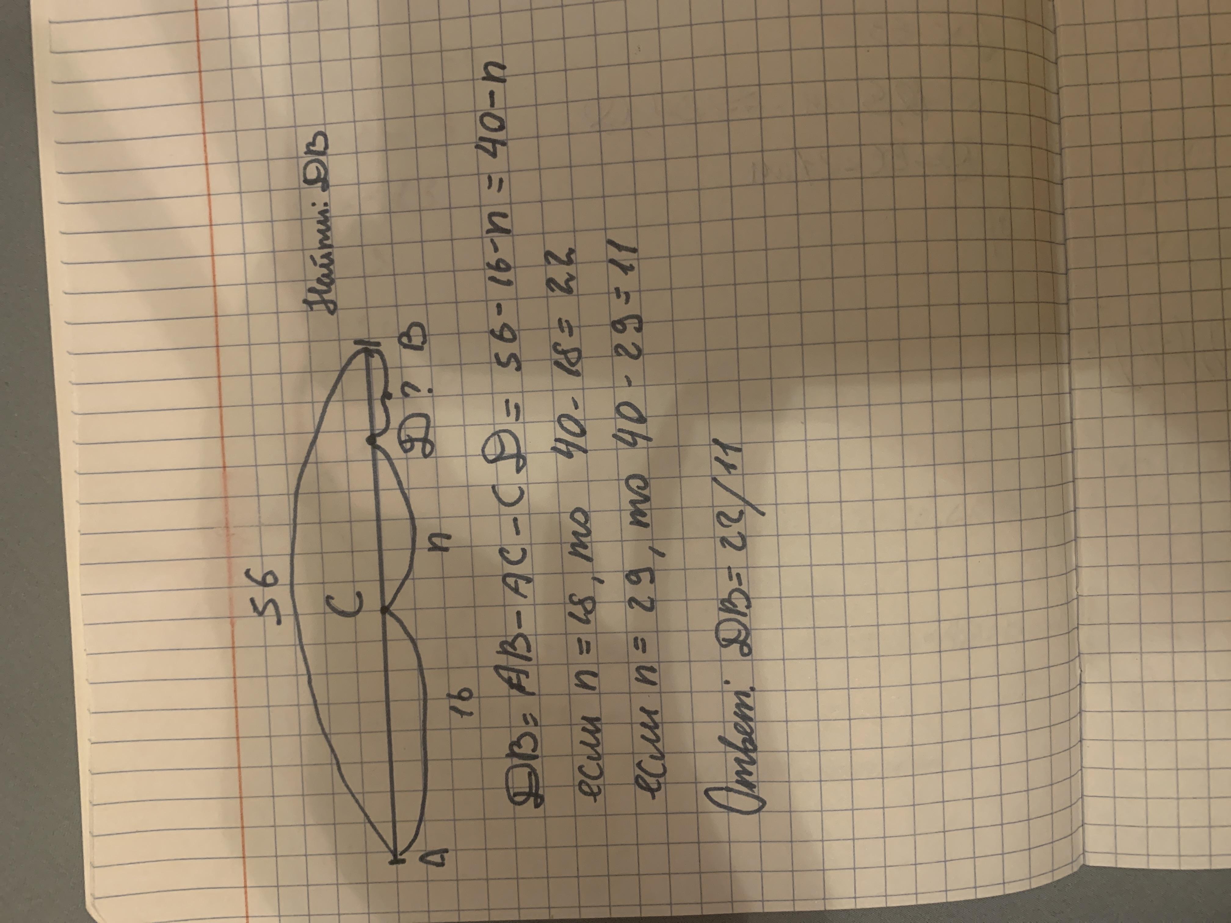 на отрезке AB отмечены точки C и D так что точка D лежит между точками C и B найдите длинну отреска DB,если AB=56 см AC=16cм и CD =n см. Упростите получившееся выражение и найдите его значение при n=18 и при n=29