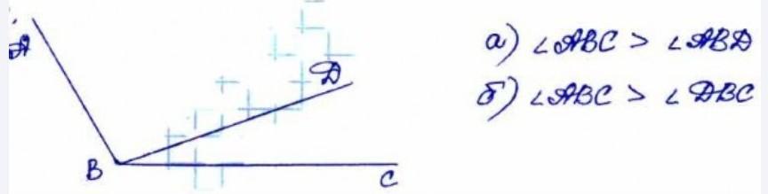 3. Начертите неразвернутый угол АВС и проведите какой-нибудь луч ВD, делящий этот угол на два угла. Сравните углы АВС и АВD, АВС и DВС и запишите эти результаты сравнения.