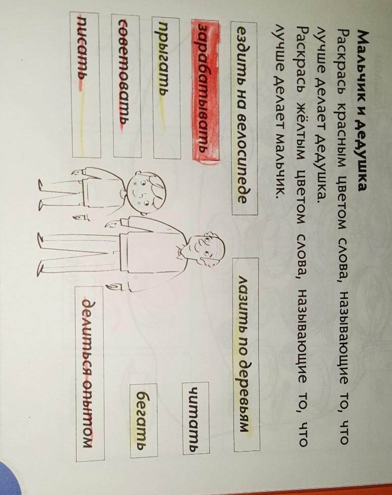 Дедушка:зарабатывать советовать делиться опытом;внук:лазить по деревьям бегать писать ездить на велосипеде