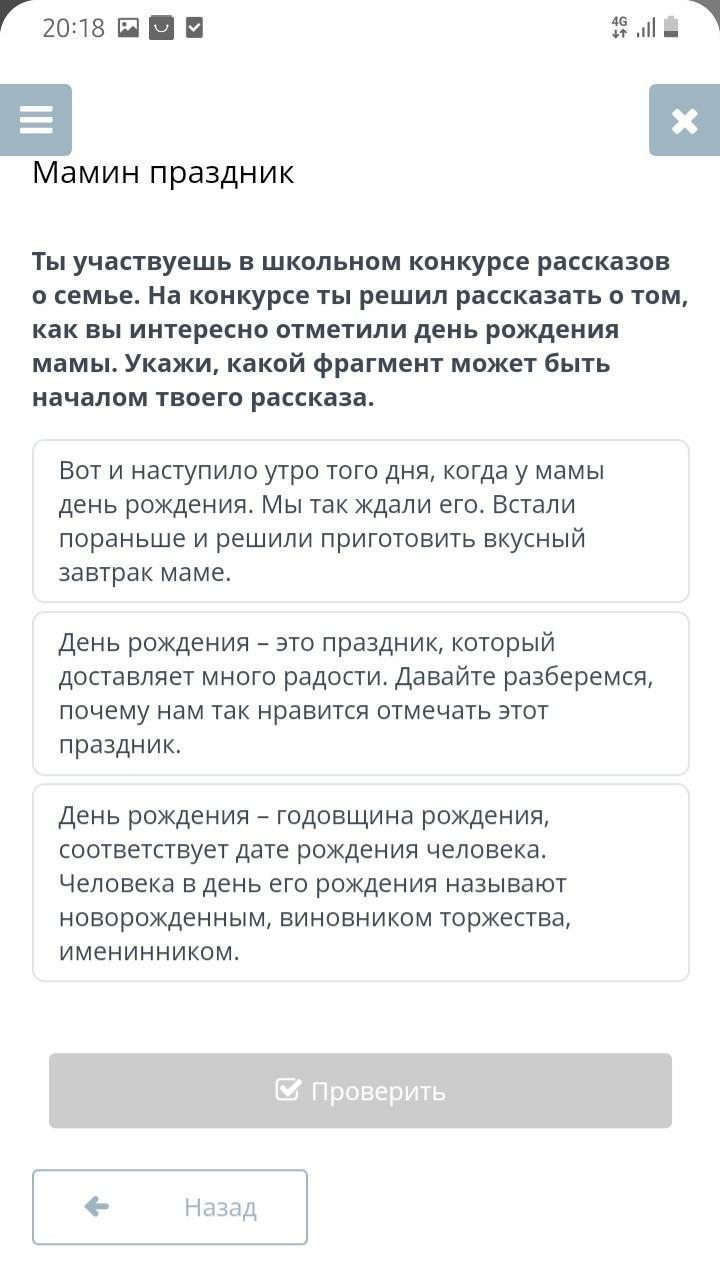 Ты участвуешь в школьном конкурсе рассказов о семье. На конкурсе ты решил рассказать о том, как вы интересно отметили день рождения мамы. Укажи, какой фрагмент может быть началом твоего рассказа.