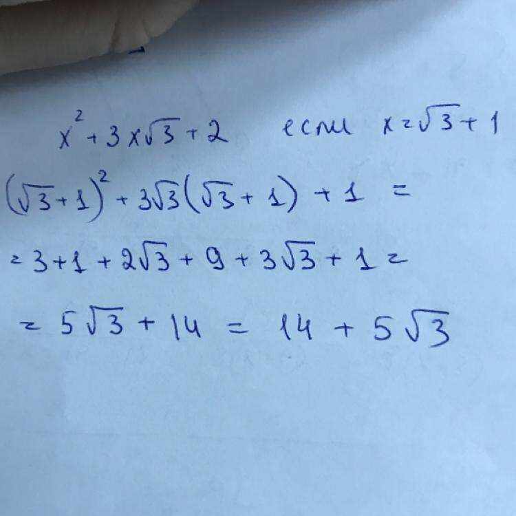 (корень из 3 + 1)**2 + 3 × (корень из 3 + 1) × (корень из 3) + 2 = 3 + 2 × (корень из 3) + 1 + 3×3 + 3×(корень из 3) + 2 = 3 + 1 + 9 + 2 + 2×(корень из 3) + 3×(корень из 3) = 15 + 5×(корень из 3)