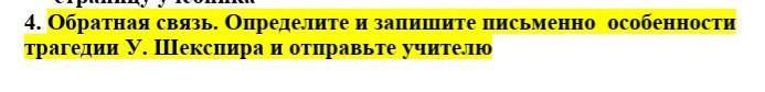 Обратная связь. Определите и запишите письменно особенности трагедии У. ШШекспира и отправьте учителю