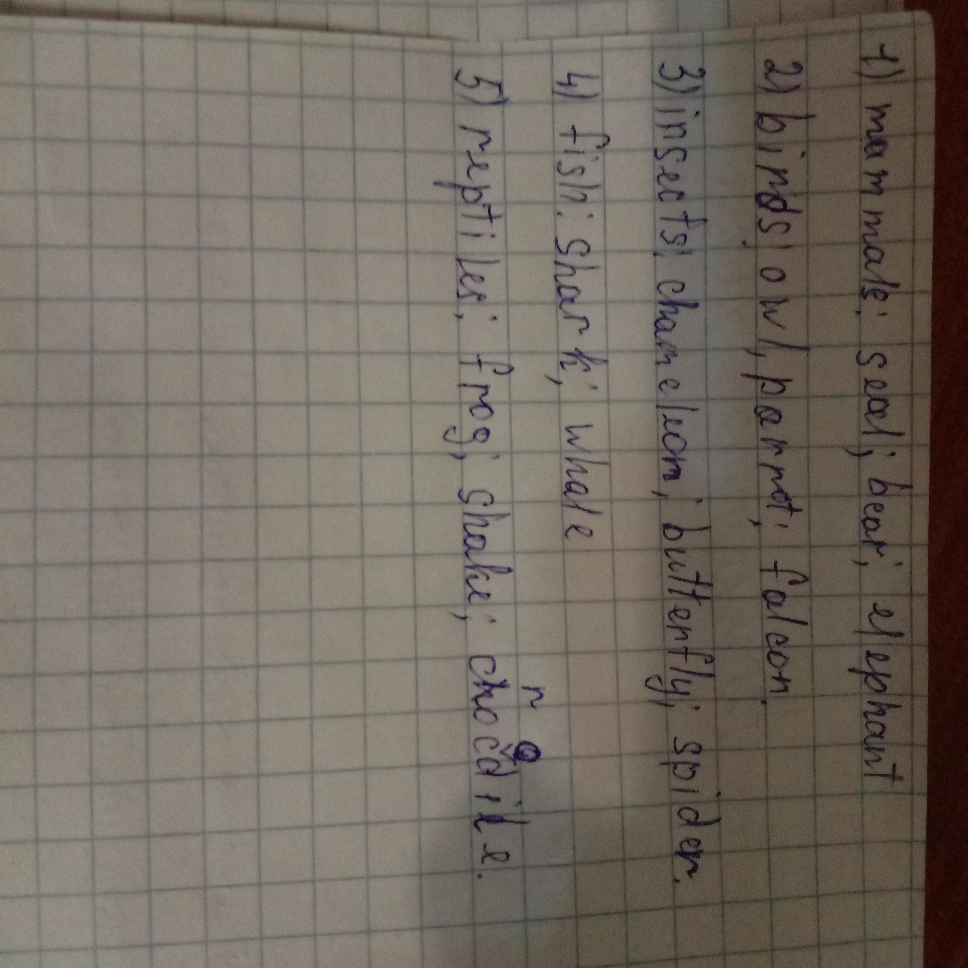 Look at the animals in exercise 1. Which animals: birds, insects, mammals, fish, reptiles? Make a mind map. Which two animals don't go in any of the categories?