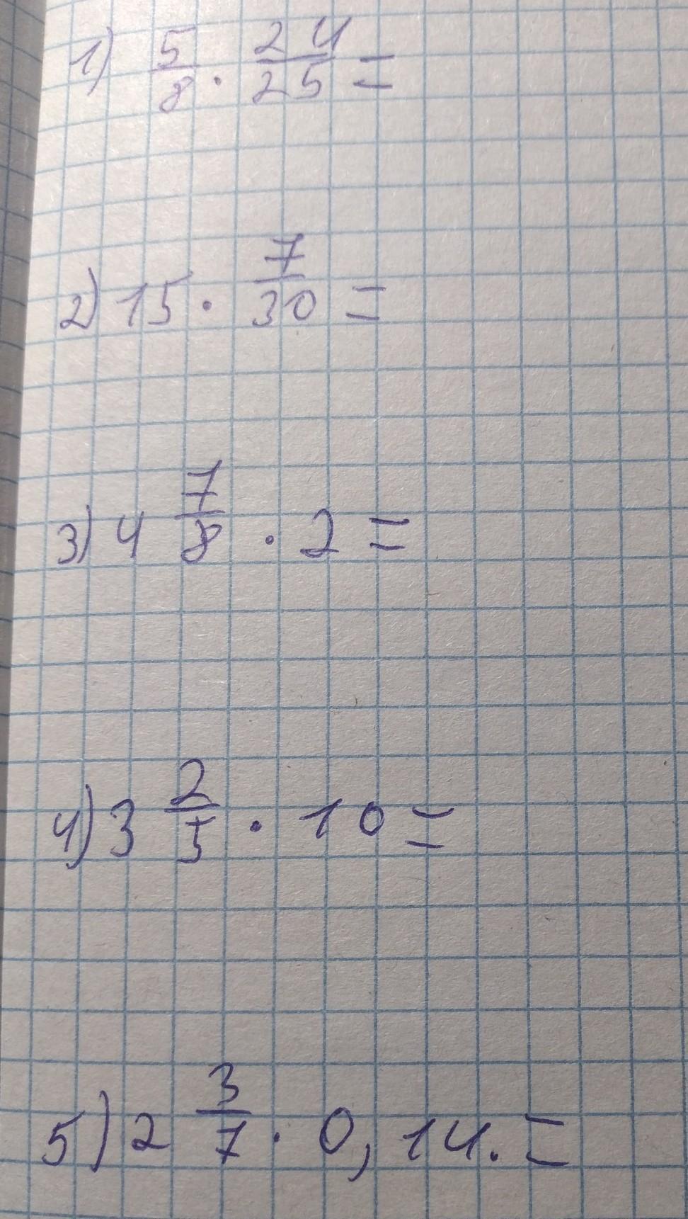 1) \frac{5}{8}  * \frac{24}{25} = \frac{3}{5} \\\\2) 15 * \frac{7}{30}= \frac{7}{2} = 3\frac{1}{2} \\\\4)4\frac{7}{8} * 2 = \frac{39}{4}= 9\frac{3}{4}  \\\\4)3\frac{2}{5} * 10 = \frac{17}{5} *10 = 34\\\\