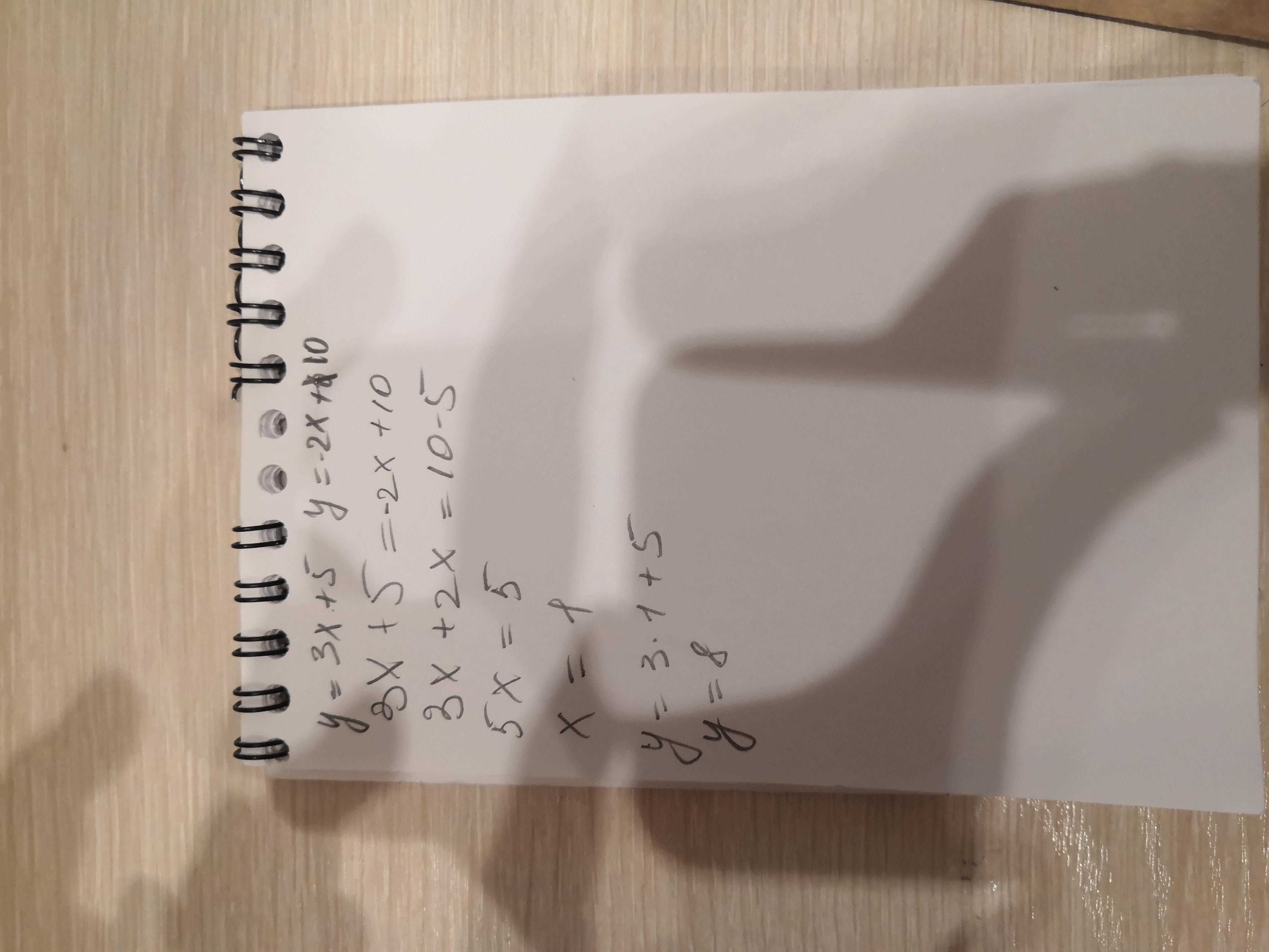 Не выполняя построения, найдите координаты точки пересечения графиков функций y=3x+5 и y=-2x+10.