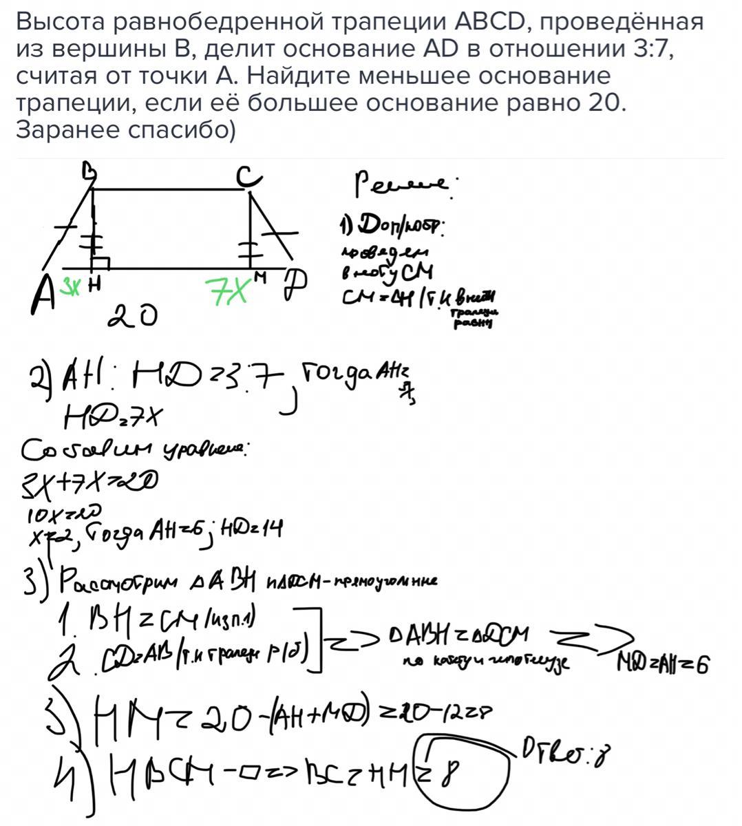Высота равнобедренной трапеции ABCD, проведённая из вершины B, делит основание AD в отношении 3:7, считая от точки A. Найдите меньшее основание трапеции, если её большее основание равно 20.