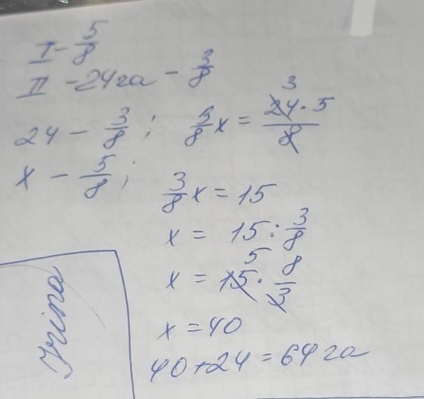 За перший день косаркою скосили 5/8 площі поля,засіяного горохом,а за другий - решту 24га.Яка площа всього поля?
