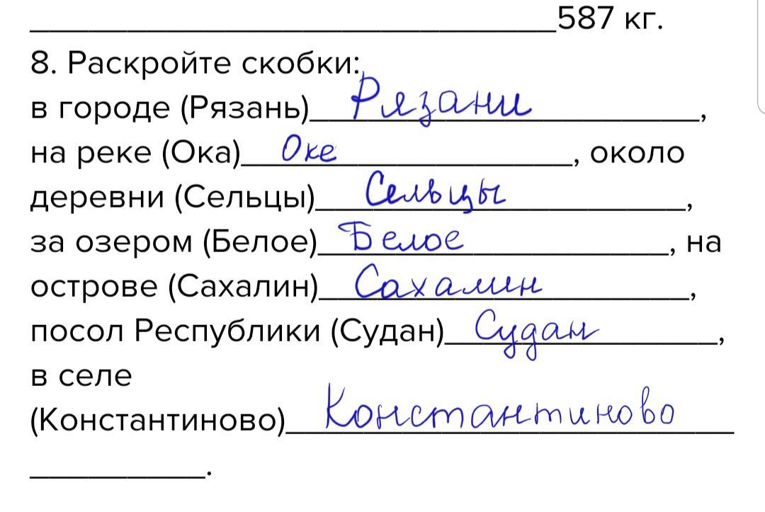 деревни (Сельцы)___________________, за озером (Белое)__________________, на острове (Сахалин)___________________, посол Республики (Судан)______________, в селе