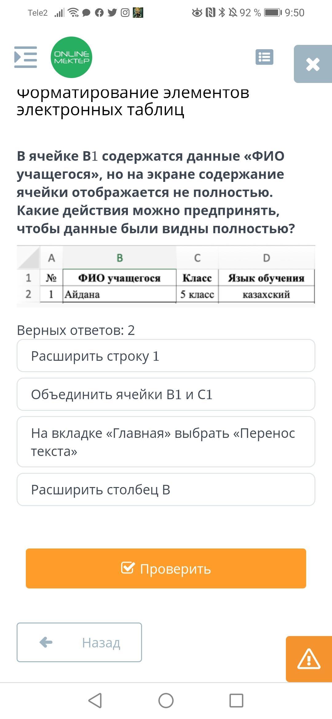 Помогите, пожалуйста В ячейке В1 содержатся данные «ФИО учащегося», но на экране содержание ячейки отображается не полностью. Какие действия можно предпринять, чтобы данные были видны полностью?
