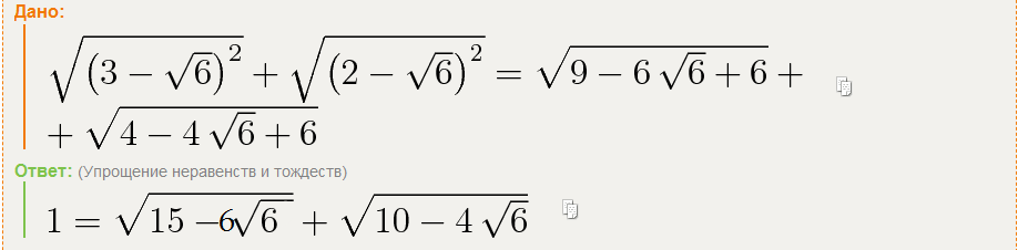((3-√6)^2)^1/2+((2-√6)^2)^1/2=|3-√6|+|2-√6|=3-√6+√6-2=1