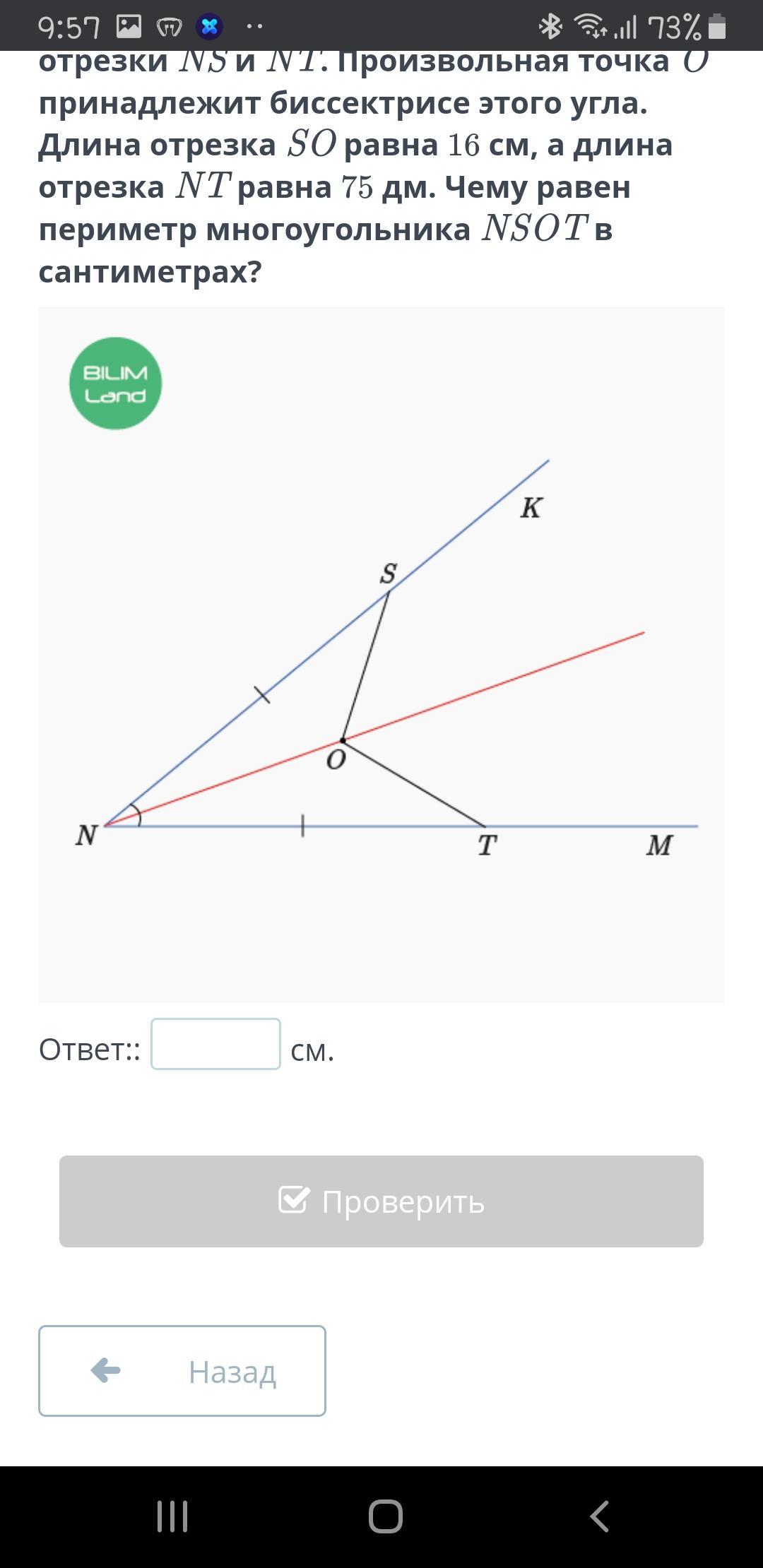 На сторонах угла MNK отложены равные отрезки NS и NT. Произвольная точка O принадлежит биссектрисе этого угла. Длина отрезка SO равна 16 см, а длина отрезка NT равна 75 дм. Чему равен периметр многоугольника NSOT в сантиметрах?