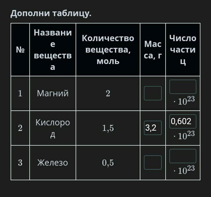 железо - 28г(масса) 3,01(число частиц)