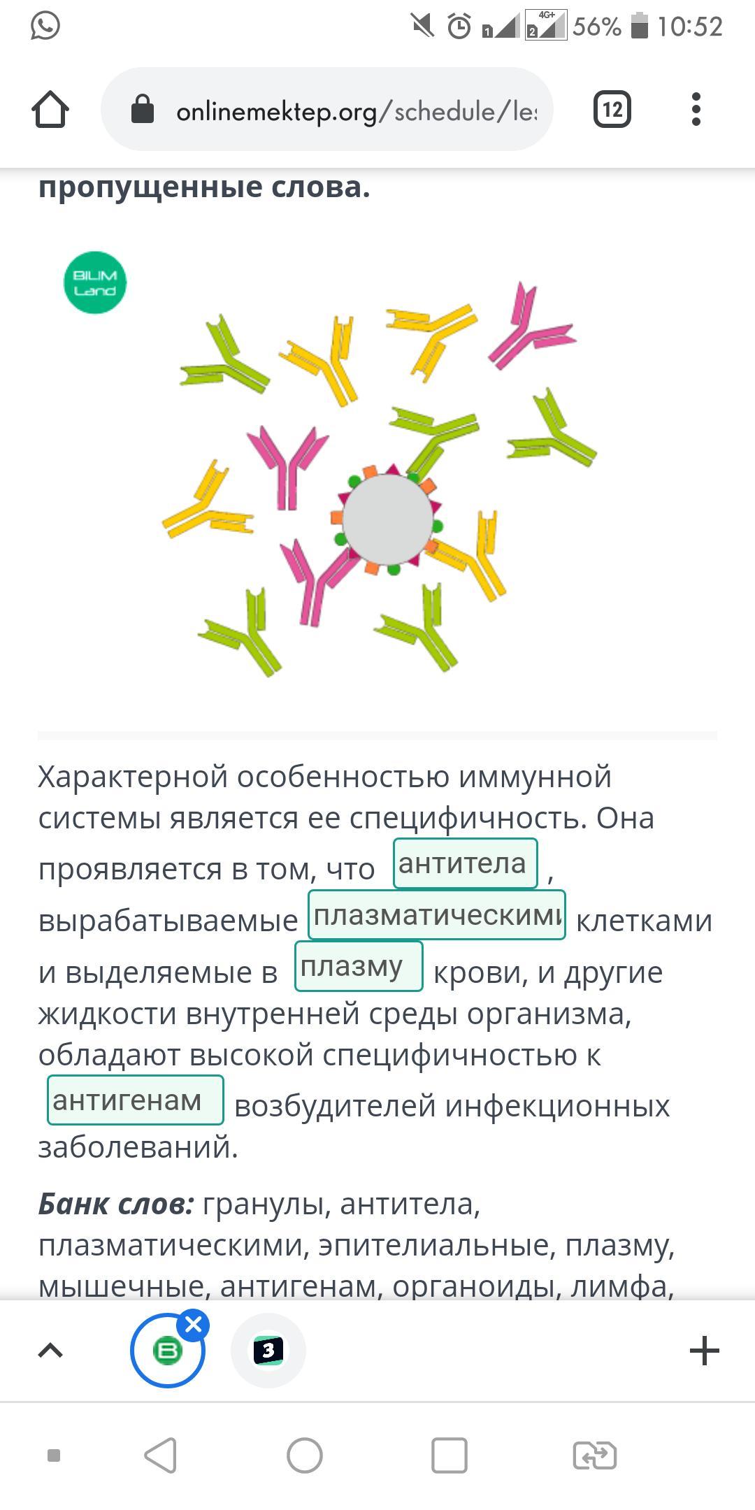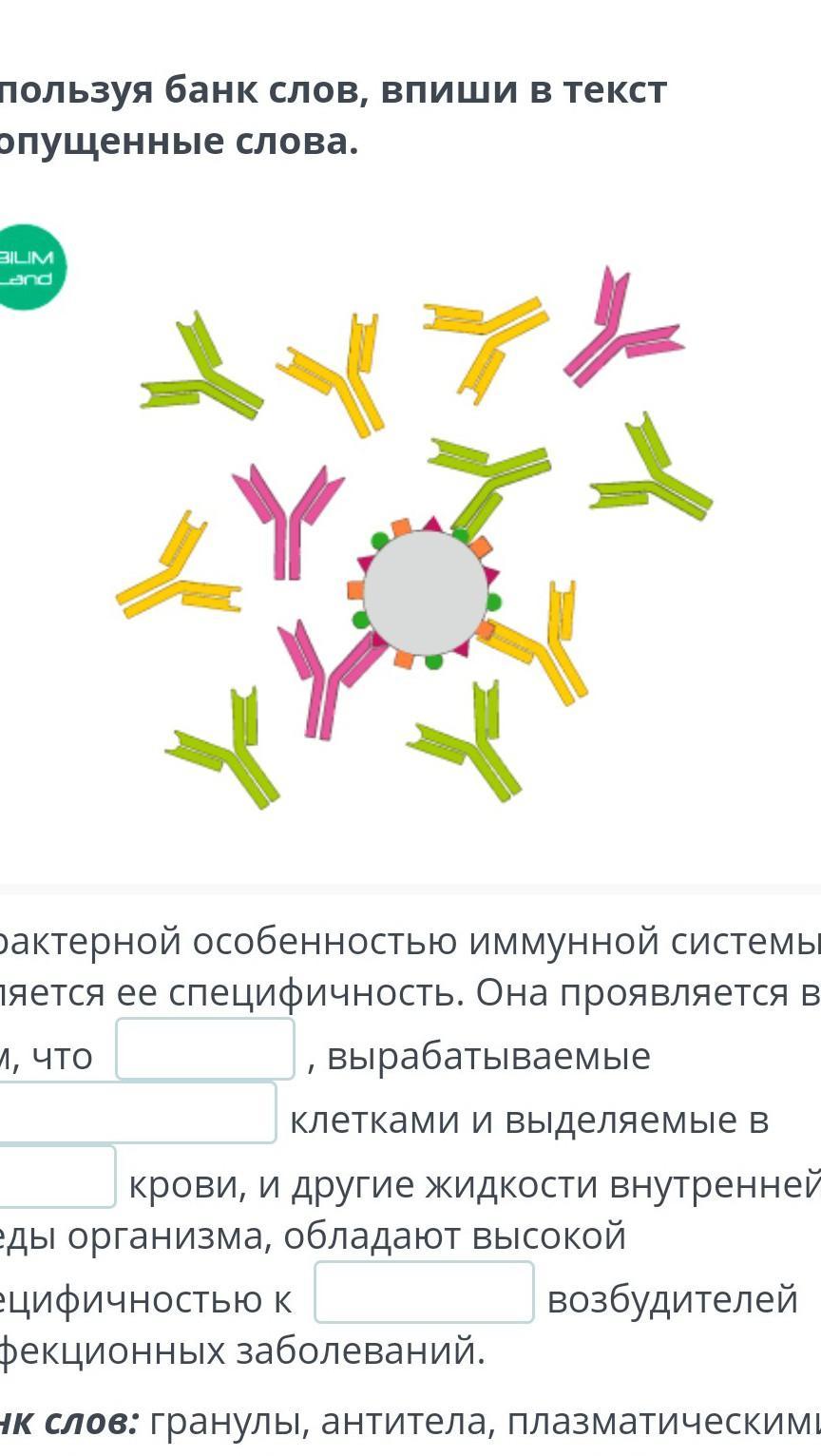 Банк слов: гранулы, антитела, плазматическими, эпителиальные, плазму, мышечные, антигенам, органоиды, лимфа, цитоплазма.
