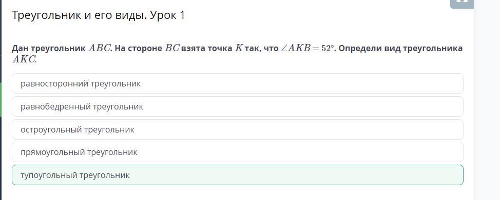 Дан треугольник ABC. На стороне BC взята точка K так, что ∠AKB = 52°. Определи вид треугольника AKC.