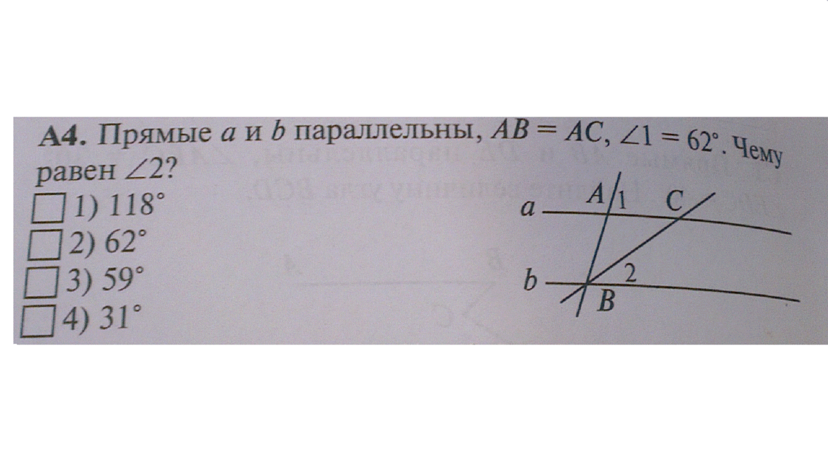 Помогите решить задачу пожалуйста. Прямые a и b параллельны, AB=AC, угол 1=62.Чему равен угол 2?