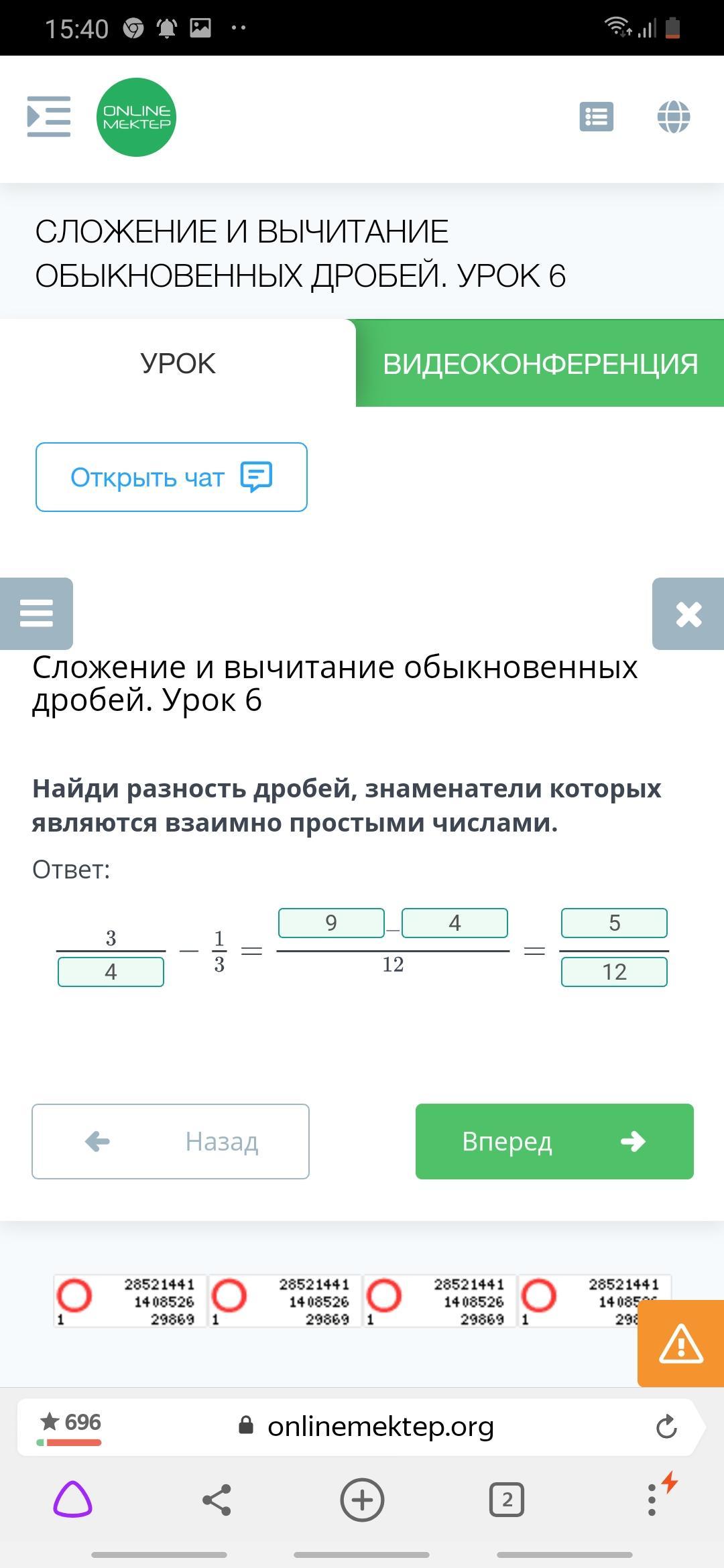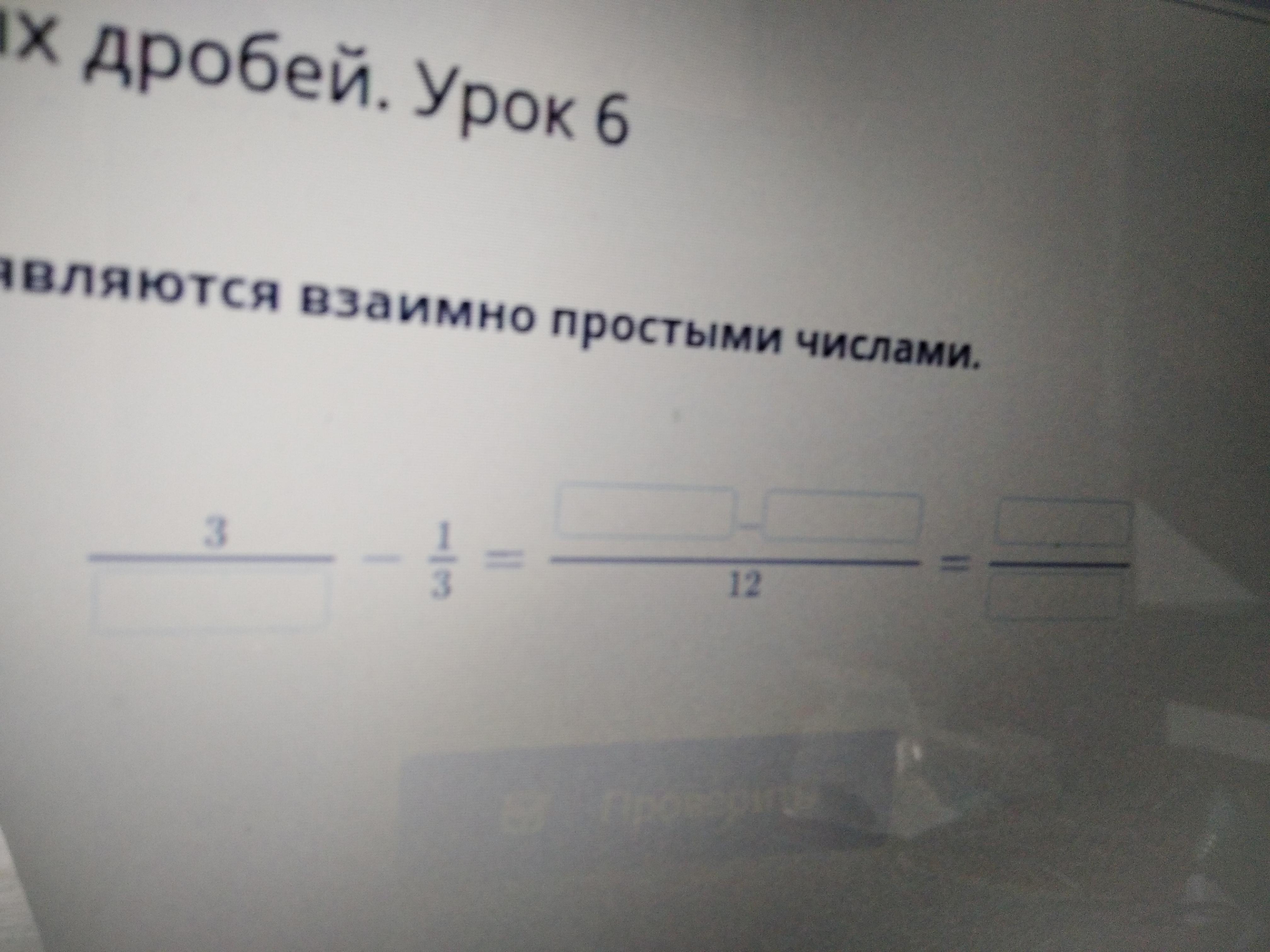 Найди разность дробей, знаменатели которых являются взаимно простыми числами. Ответ:3/*-1/3=*-*/12=*/*