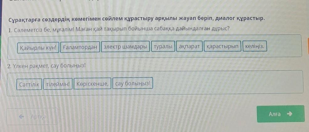 Сұрақтарға сөздердің көмегімен сөйлем құрастыру арқылы жауап беріп, диалог құрастыр.