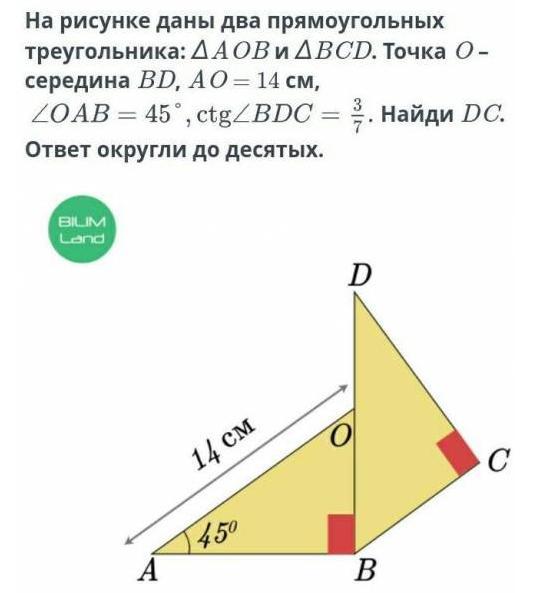 на рисунке даны два прямоугольных треугольника: угол АОВ и угол BCD. Точка О-середина BD, АО=14 см, угол ОАВ=45°, ctg угол BDC=