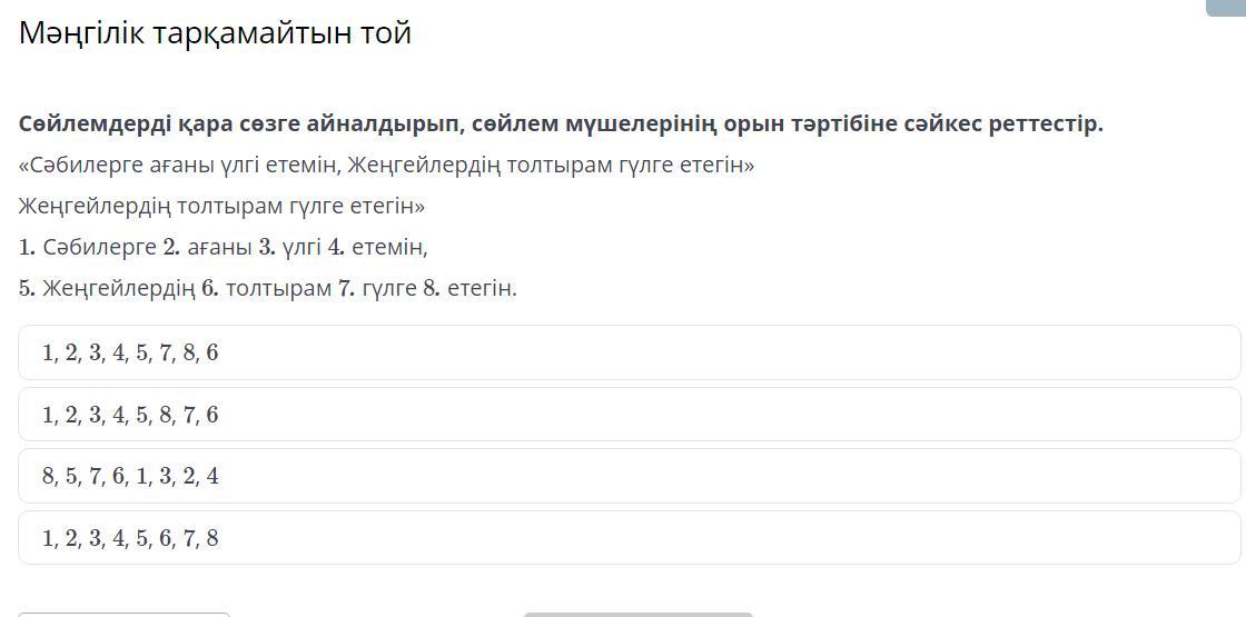 «Сәбилерге ағаны үлгі етемін, Жеңгейлердің толтырам гүлге етегін» Жеңгейлердің толтырам гүлге етегін» 1. Сәбилерге 2. ағаны 3. үлгі 4. етемін, 5. Жеңгейлердің 6. толтырам 7. гүлге 8. етегін.